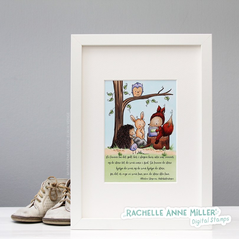 The image itself is almost square, so I had to come up with something to fill the space to make it fit in my frame. I chose a quote from a children’s book from 1953 that every Norwegian knows pretty much by heart. The English title is “Claus Climbermouse and the other animals in the Huckybucky forest”. Early on in the book, the fox, the porcupine and the owl all try eating the smaller animals, particularly the mice. The fox is pretty much always hungry because the mice keep getting away. At one point all the animals attend a meeting in the forest, held by the bear, where one of the mice suggests they pass a law that says that all the animals have to be friends, none of them can eat the others, and that the ones that are too lazy to find food themselves, aren’t allowed to steal food from others. The law is passed, even though the owl, porcupine and fox don’t entirely agree.