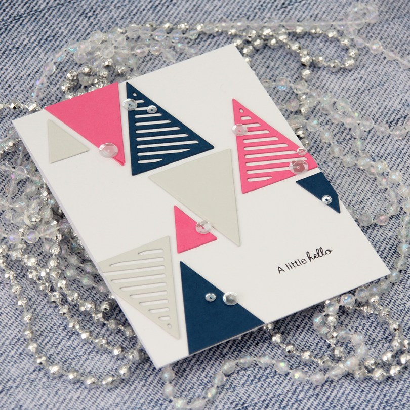 I glued all the triangles to my white cardbase a little haphazardly, added some Pretty Pink Posh sequins to embellish a tiny bit and stamped a sentiment from an Inky Wings stamp set using VersaFine Onyx Black and called it done.