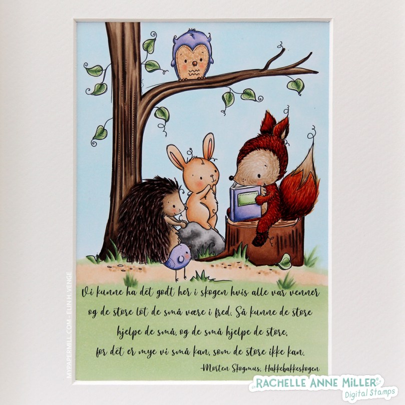 The image itself is almost square, so I had to come up with something to fill the space to make it fit in my frame. I chose a quote from a children’s book from 1953 that every Norwegian knows pretty much by heart. The English title is “Claus Climbermouse and the other animals in the Huckybucky forest”. Early on in the book, the fox, the porcupine and the owl all try eating the smaller animals, particularly the mice. The fox is pretty much always hungry because the mice keep getting away. At one point all the animals attend a meeting in the forest, held by the bear, where one of the mice suggests they pass a law that says that all the animals have to be friends, none of them can eat the others, and that the ones that are too lazy to find food themselves, aren’t allowed to steal food from others. The law is passed, even though the owl, porcupine and fox don’t entirely agree.