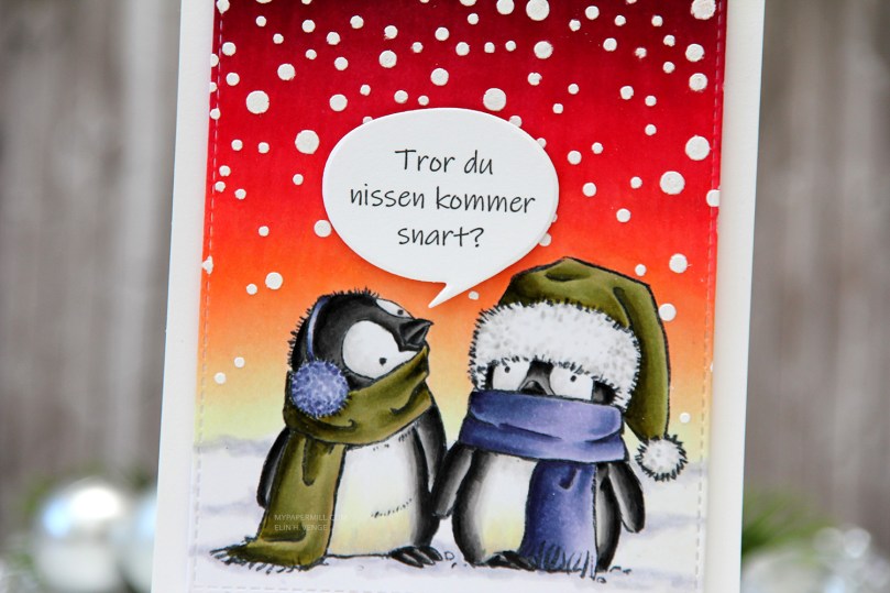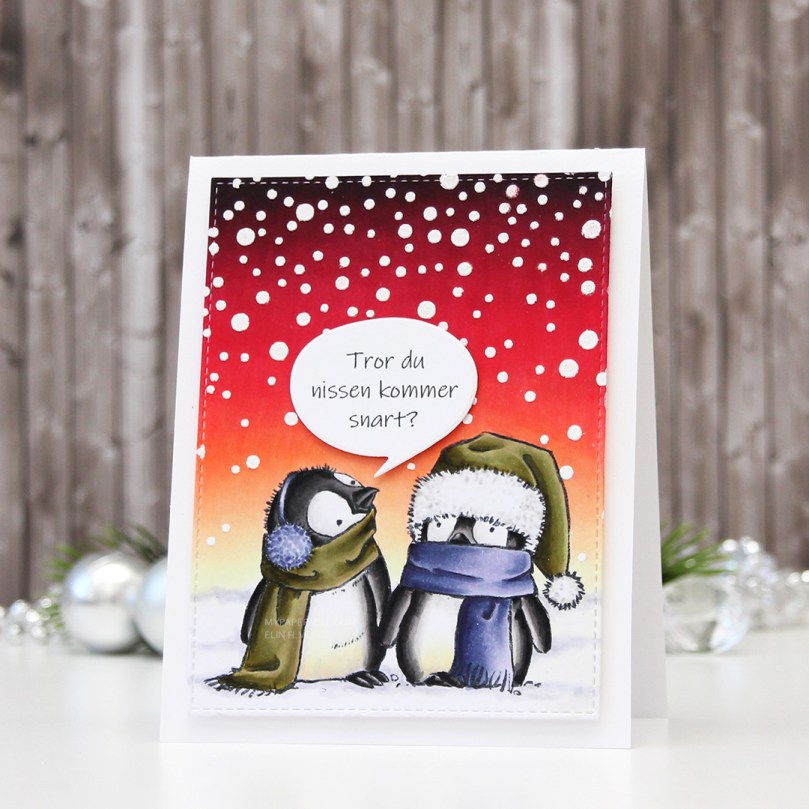 Once the sky and ground were done, I colored my penguins. My last penguin coloring had very textured, fluffy penguins, and I wanted a different look on these and kept the coloring more flat and added white bellies with a little hint of yellow, and even some purple added in. I used the second largest die from the Stitched Rectangles STAX Set 2 from My Favorite Things to create a panel, before going in with a texture paste from Kreul and a stencil from Simon Says Stamp to create snow.