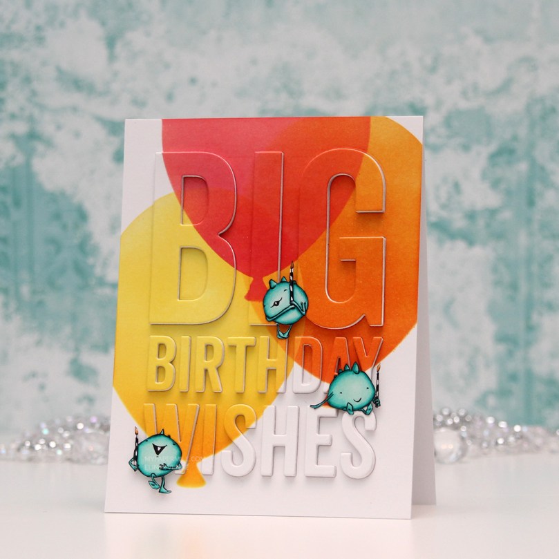 I die cut the Big Birthday Wishes die from My Favorite Things five times from Stamper’s Select White card stock from Papertrey Ink, as well as from the blended piece, which is also Stamper’s Select White. It’s my favorite white card stock, I haven’t found one that’s more white than this, and it’s also wonderfully sturdy at 110 lb. I did a layered inlay, then fussy cut my monsters and placed them strategically on my card. I love that the top one looks like he’s balancing on the top of the H, and the one on the right is leaning on the E while dangling his feet from the top of the S.