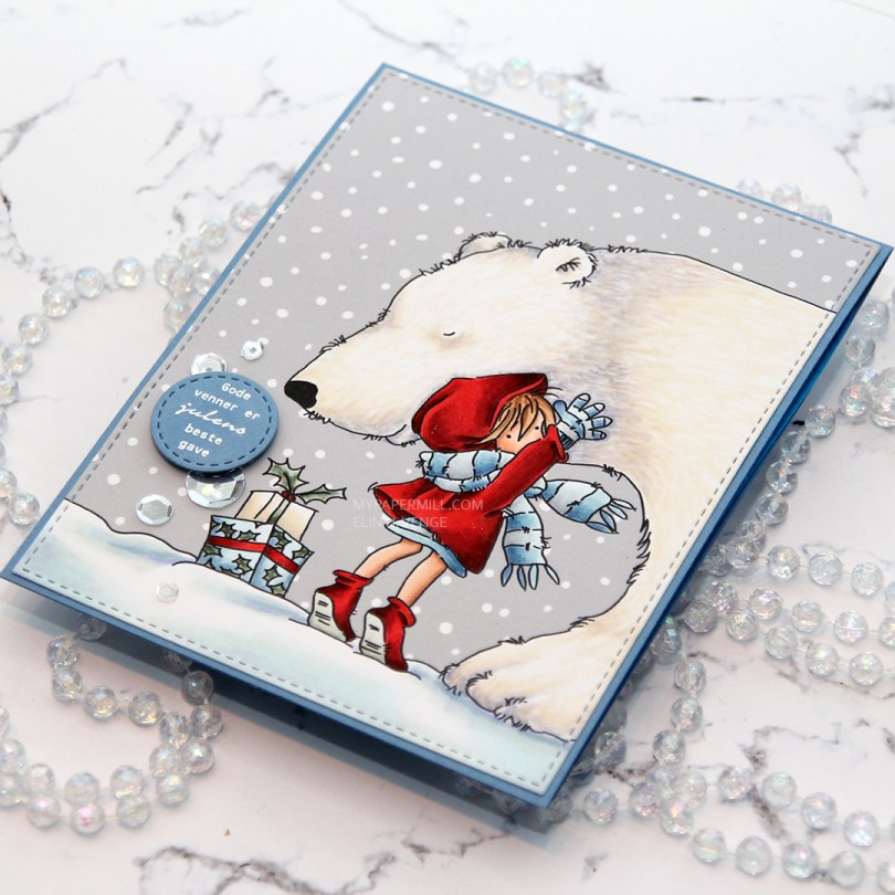 I die cut the panel with the girl and the polar bear with the largest faux stitch rectangle die from My Favorite Things from their Stitched Rectangles STAX 2 set of dies.