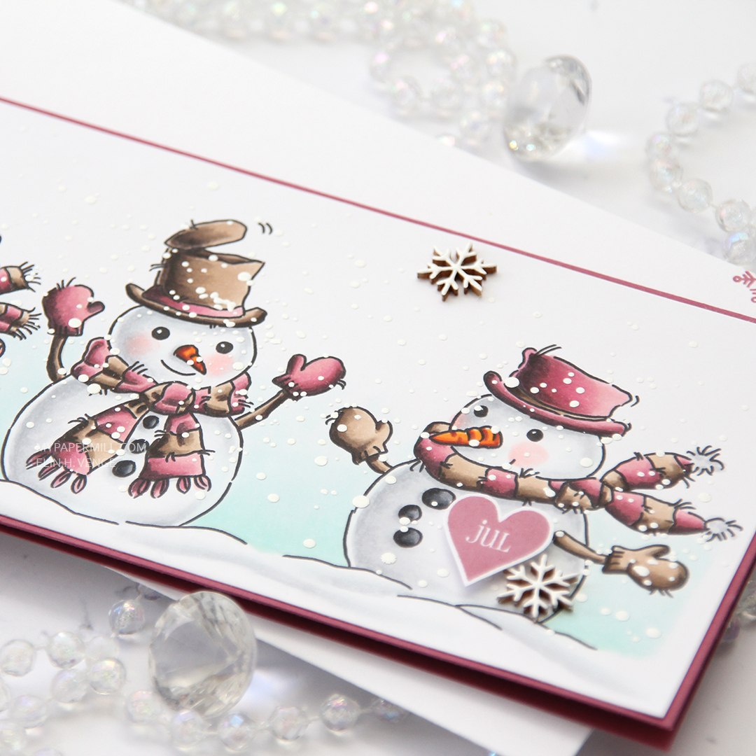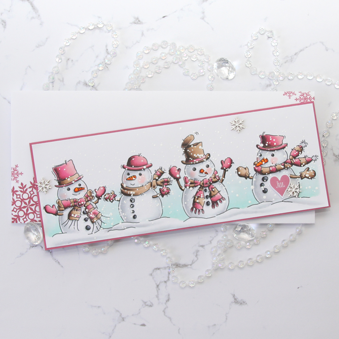 After coloring all my snowmen with Copics, I added a sprinkling of chunky white embossing enamel from Stampendous and heated my panel from the back until all the granules had melted. It warped quite a bit, so I ran the panel through my Gemini Jr without any dies, just sandwiching the panel between my cutting plates. That took care of the warping, and I could continue by gluing the panel of snowmen to the cardbase, before popping up a Norsk Stempelblad AS heart sentiment that I stamped using Autumn Rose ink. I also added a few Crafty Moly snowflakes that I covered in three layers of white embossing powder.