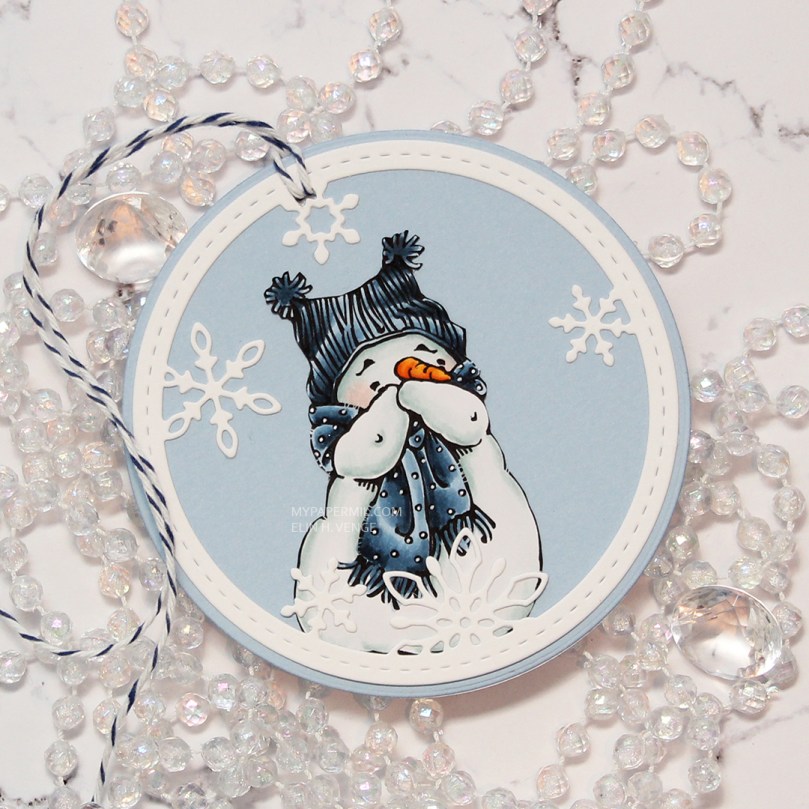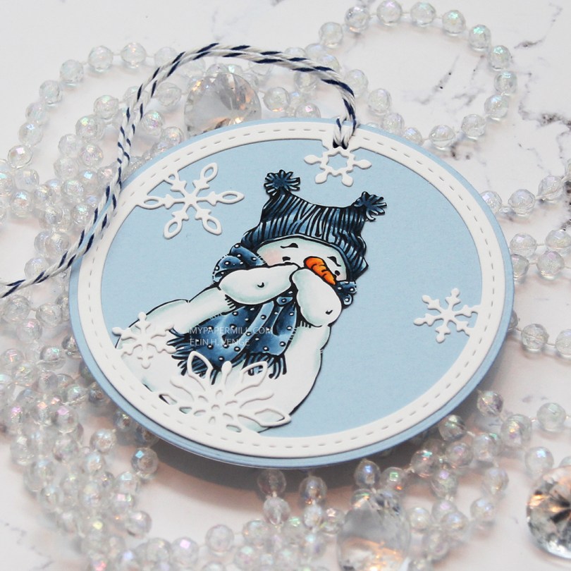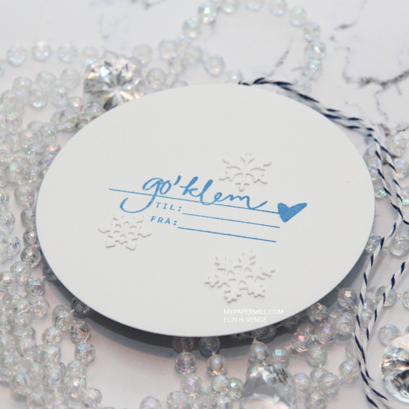 On the back I glued a white diecut circle. I stamped a to/from stamp from Norsk Stempelblad AS using Blueberry Sky ink from Papertrey Ink. I also added a few snowflakes die cut from another Memory Box die, and my gift tag was finished.