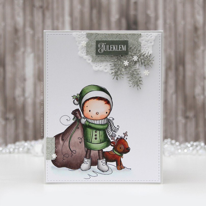 Once I’d colored in my image, I used my favorite faux stitch rectangle die from My Favorite Things to turn my colored piece into a panel for the front of my card. I added about half a tiny paper doily from Doodlebug Design, and some die cut scraps of Maja Design patterned paper, before adding a green strip with a word (Christmas hug) from Papirdesign using foam tape.