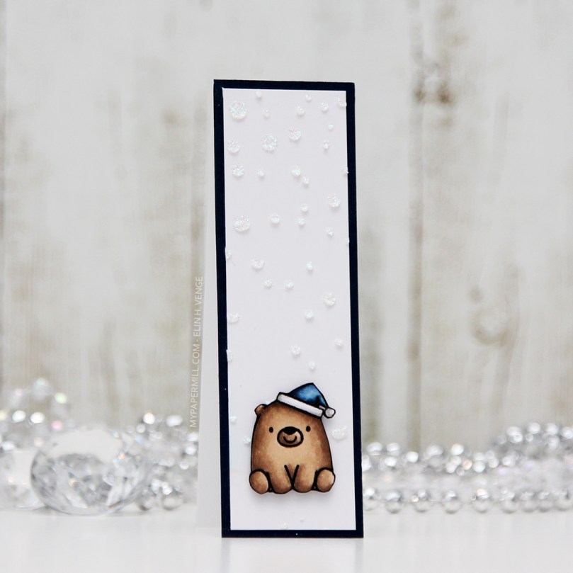 I had a leftover piece from a card I made earlier this year, so the dark blue base and the texture paste snow falling down are elements that were both already there. My initial plan was to make that particular card a regular, landscape A2 sized card, but the design didn’t really work for the format, so I chopped off about 1 1/4″, which was the perfect width for this bear. All I really did for this one was stamp, color and fussy cut the bear from the Bitty Bears stamp set from My Favorite Things before, before using foam tape to pop him up a little bit from the rest. Because the base of this was once part of a card, this gift tag stands up on its own. I haven’t even punched a hole through it, I think might be enough to slip it over the ribbon on a present.