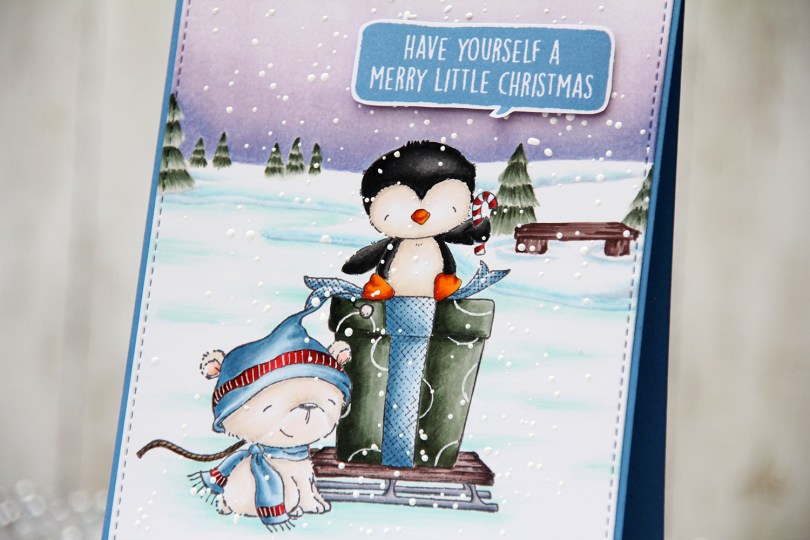 The little polar bear’s name is Icicle, and the penguin’s name is Merry, I love that these characters actually have names! I put Merry on a sled, masked everything and stamped the frozen pond horizon behind my cute critters using fadeout ink from Inkon3.