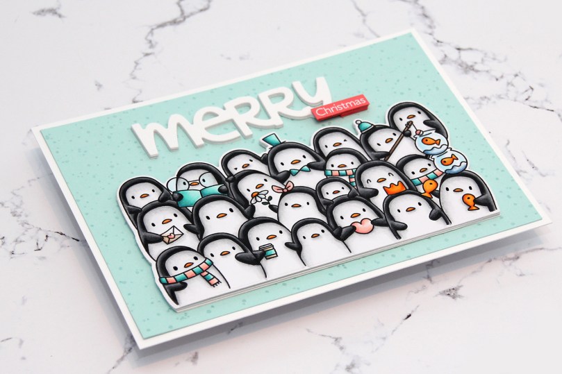 The Penguin’s Waddle die set comes with a big word die “Oh so merry”. I die cut it several times from white cardstock, cut the “oh so” away to use just merry on my card and spritzed some sparkly sheer shimmer spray on top, which you can kind of see in this photo if you look closely. I stamped and white heat embossed the word Christmas from the Christmas Cheer stamp set from My Favorite Things onto Berry Sorbet cardstock from Papertrey Ink, then used my Cut-align ruler from Misti to make sure I’d cut the little strip straight. In this photo you can also see the shine in the penguins’ eyes. I added a little bit of black glaze pen to the eyes, and also a little bit of clear Wink of Stella to certain elements.