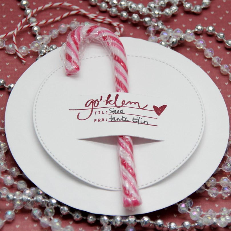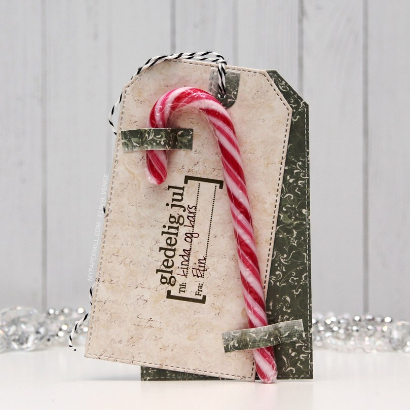 On the back of the tag I die cut an additional two tags from patterned paper from Maja Design and stamped a To/From stamp from Norsk Stempelblad AS using Olive Twist ink from Papertrey Ink. I used a couple of strips of patterned paper to get a candy cane in there, as well.