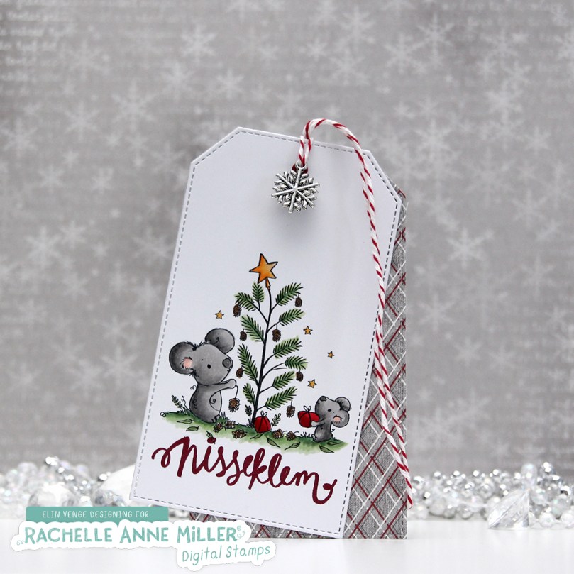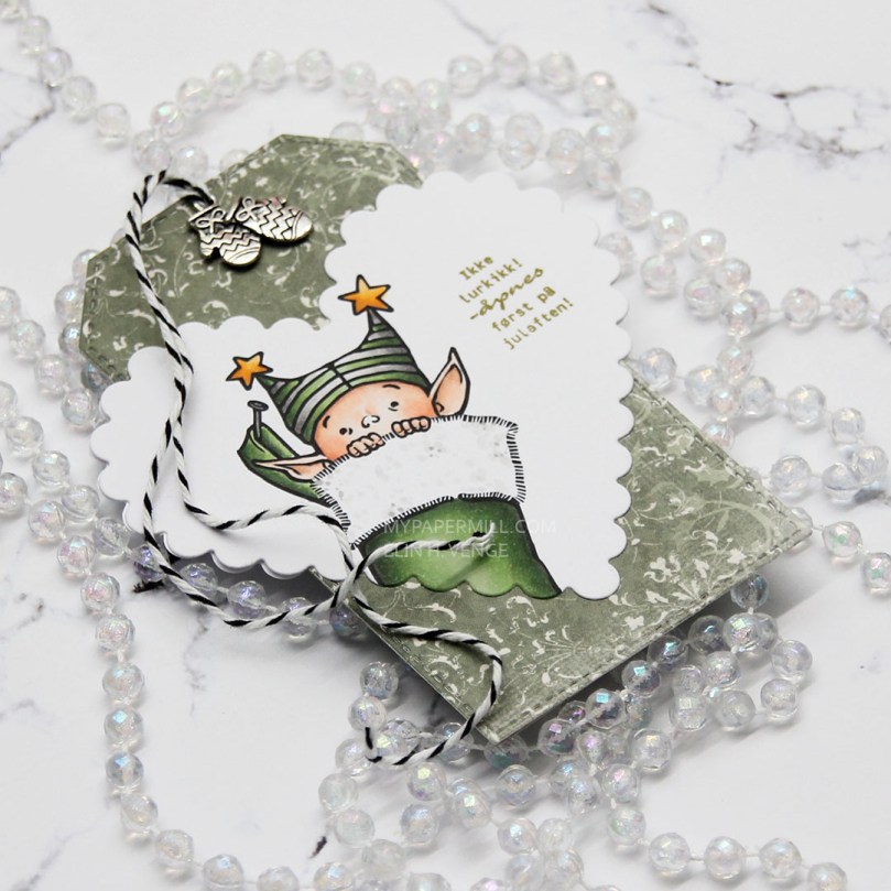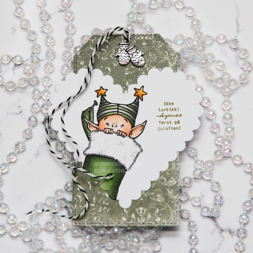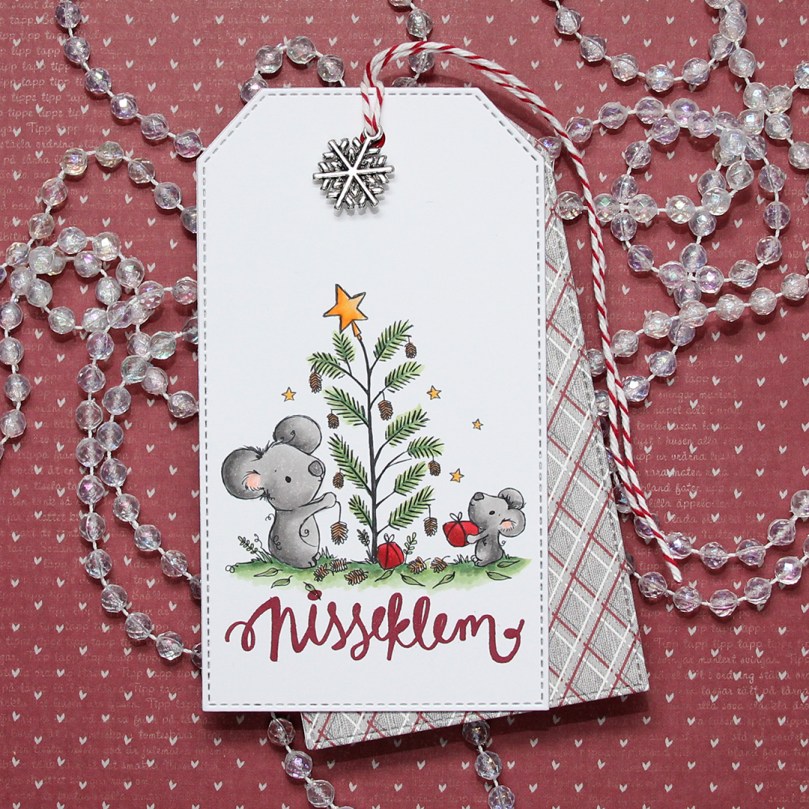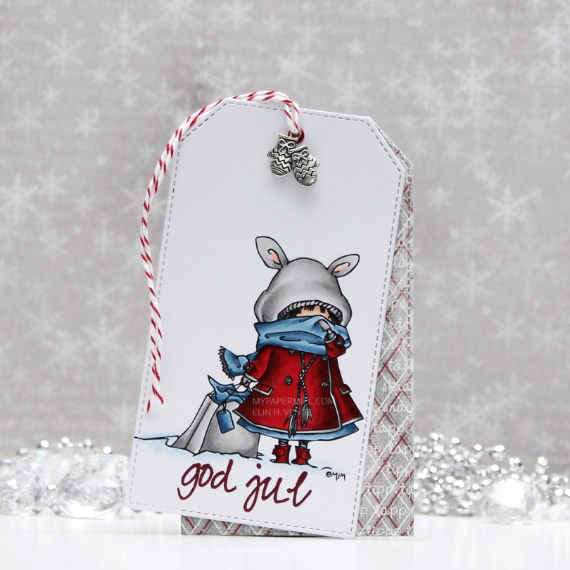 I colored the image with Copics, die cut it using a large faux stitch tag die from My Favorite Things and stamped a sentiment from Norsk Stempelblad AS on the bottom using Scarlet Jewel ink from Papertrey Ink. I created three more tag die cuts from the Fröjdefull Jul collection from Maja Design and glued one of them to the back of my colored panel. I glued the other two back to back and glued my two double tags together, slightly offset. I cut a hole at the top of the tag, used a red eyelet for strength and threaded some red twine through, adding a charm with mittens for that little bit extra.