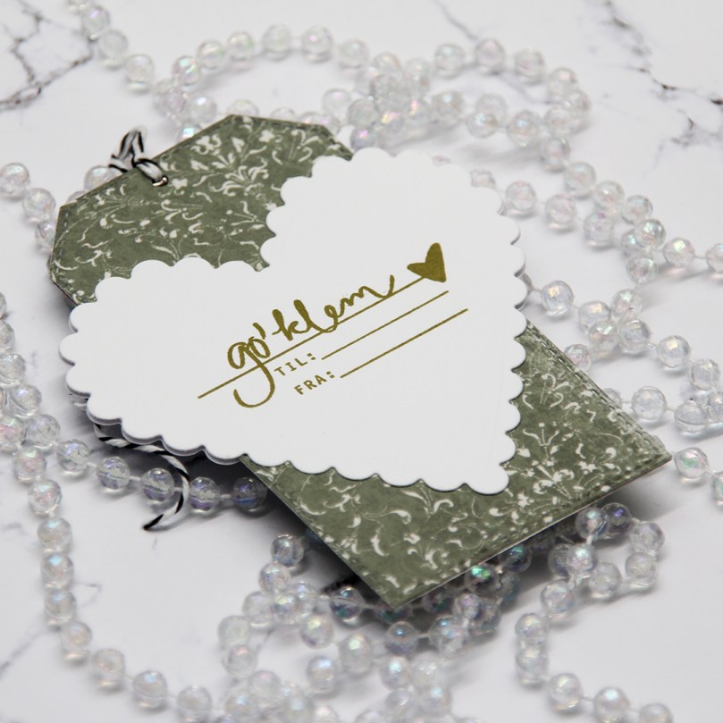 I decided to go for a version in gray and green, and used a die from Papirdesign to create a scallop heart for the front of my gift tag. I stamped a sentiment from Norsk Stempelblad AS using Ripe Avocado ink from Papertrey Ink.