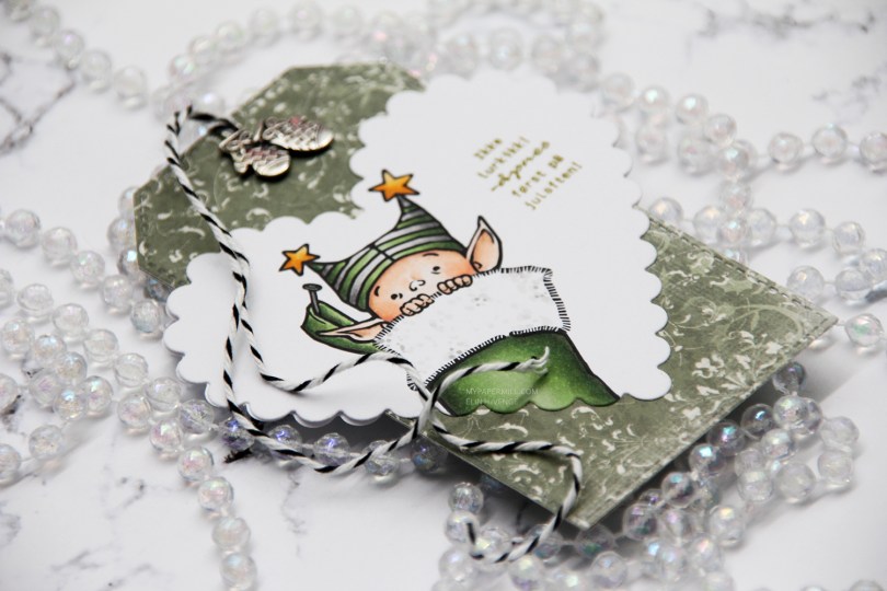 On the back of the tag I stamped a To/From stamp from Norsk Stempelblad AS using Smokey Shadow ink from Papertrey Ink, which is a nice dark gray. I attached a couple of loops I made from one of the patterned papers and was able to thread a candy cane through, I just hope the dog doesn’t get into the presents and eats the candy cane.
