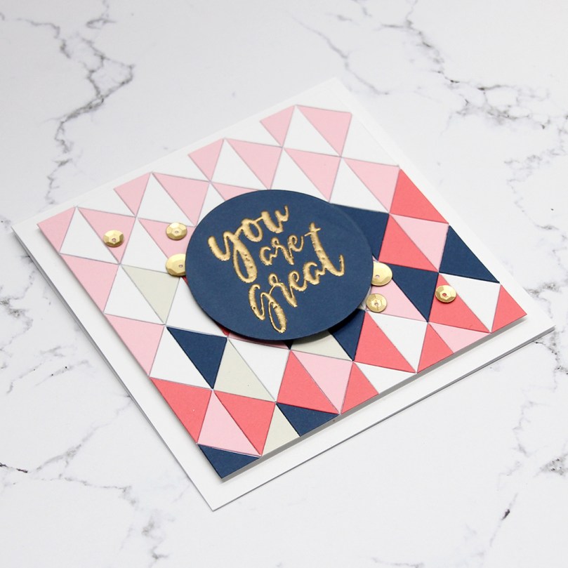 I popped my panel of triangles onto a 4 3/4″ square card base using lots of foam tape. On a die cut circle I stamped and gold heat embossed a sentiment from the Courageous You stamp set from Altenew, before finishing off the card with a few matte gold sequins from the Mint Gold mix from Little Things from Lucy’s Cards.