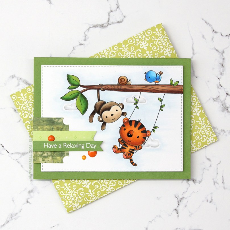 I colored the image with Copics and die cut it using the second largest die in the A2 Stitched Rectangles STAX 2 set from My Favorite Things, before adding it to a card base made from Gumdrop Green Heavyweight card stock, also from MFT, using lots and lots of foam tape. I used a black Glaze pen to add some dimension and shine to their eyes and noses.