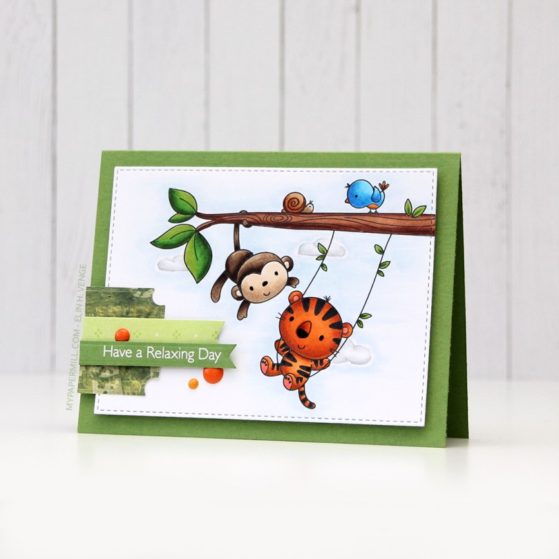 I’m one of those people that use patterned paper on my cards. I don’t use lots, and I pretty much always use them for small clusters, but my ancient stash of patterned paper is shrinking ever so slightly with each card. I have a tub of die cut patterned paper scraps on my desk, and rummage through it to find the perfect pieces for my clusters. The dark green patterned paper I used here is actually from 2005, which was years before I started making cards. I stamped one of the sentiments from the Always Bring a Smile stamp set from My Favorite Things onto a separate piece of Gumdrop Green card stock and die cut it using one of the dies in the Slimline Starter die set. I finished off my card with a few enamel dots from Papirdesign to match the tiger and the details on the bird.
