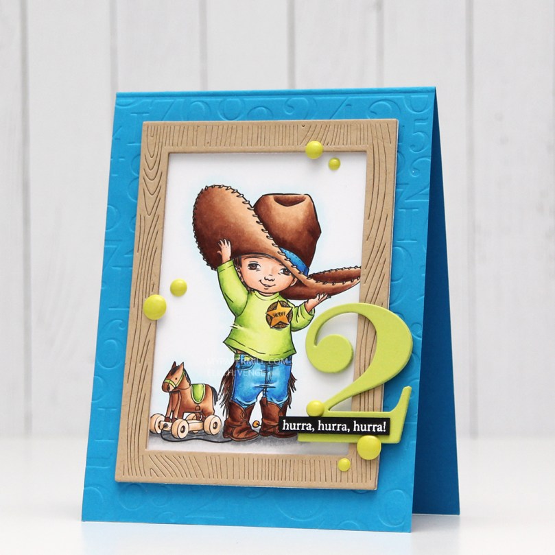 I colored up the image with my Copics. Nothing unusual about that, but these blues are brighter than the ones I normally use. The colored panel was too narrow to fill the width of a regular card, so I decided to put a frame around it. I used one of the wood frame nested dies from Hero Arts to create my frame from Classic Kraft card stock from Papertrey Ink, and built up layers by adding a few more frames behind the top one. I created a card bas from Lush Lagoon card stock from Papertrey Ink, and used the By the numbers impression, also from PTI, to create a debossed look to the card base. There’s quite a bit of blue showing outside the frame, so I wanted a little bit of texture there.