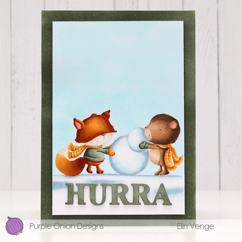 I stamped the bear using fadeout ink from Inkon3 and masked him, before stamping the fox in the same ink. While I still had the stamps in my MISTI, I stamped their eyes, mouths and noses using Memento Espresso Truffle ink. This saved me from having to draw the details back in after my coloring, which could have potentially ruined the entire scene. I used my Copics to color everything, and trimmed the panel down slightly. I used one of the greens from the image on the edges of a 5×7″ piece of X-Press It blending card to make the card front match the image, as I didn’t have any card stock in the right shade of green. For the die cut HURRA (die from Kort & Godt), I scribbled one of the green Copics onto a scrap piece of X-Press It before die cutting. I added another three white die cuts behind it for dimension, and used foam tape on the back of the colored panel to give it a little lift up from the card base.