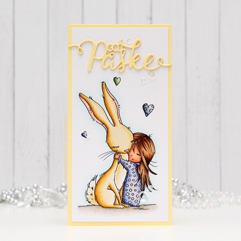 I wanted a soft look to this, but at the same time, I also wanted to change things up a bit. I went with a darker skin tone than I normally do, and I really wanted a soft yellow bunny. I printed the image onto a piece of X-Press It blending card cut to 3×6″ for a mini slimline card. I adhered it to a card base I made from Lemon Tart card stock from Papertrey Ink with a 1/8″ border. I used the same color card stock to die cut “God påske” (Happy Easter in Norwegian) using a die from Papirdesign. I stacked three die cuts on top of each other and used a sparkle shimmer spray from Imagine to add lots of shimmer to the die cut. It has a really nice shimmer in real life, even though you can’t see it in the photo. To finish off the card I added a few sequins from the White Orchid sequin mix from Little Things from Lucy’s Cards.