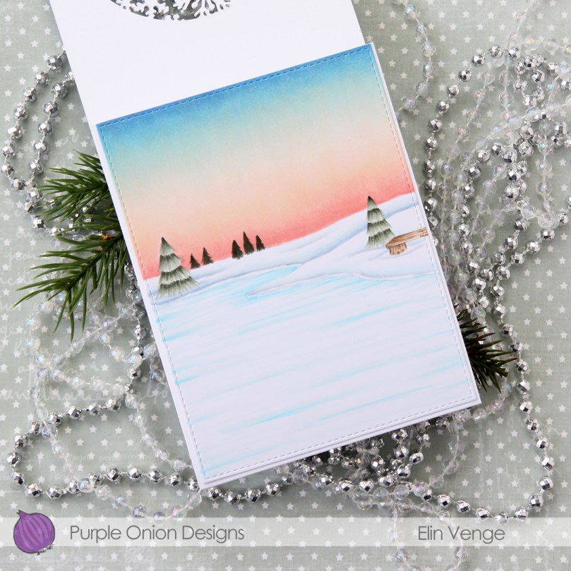 For the inside panel that you can see from the front, I stamped the Frozen Pond using fadeout ink from Inkon3 and colored in the entire panel, before using the same stitched rectangle die that I used for the front for a nice finished edge. This entire panel flips down, leaving lots of space on the inside for a personal message.