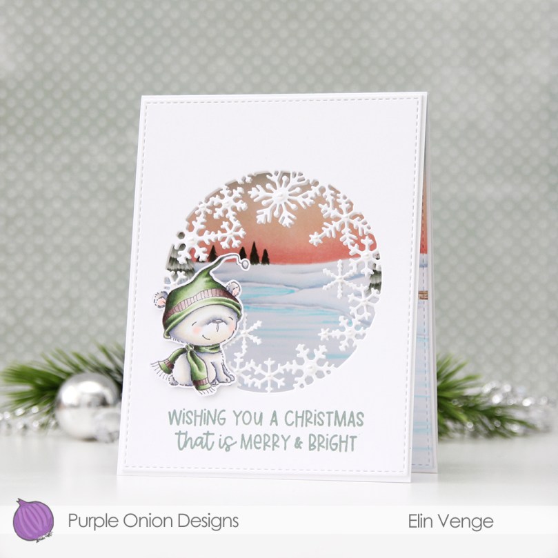 I love the snowflake circle die from Hero Arts and have used it many times before. I die cut a window into the center of the front of my card base, and at first thought that would be it. Once it morphed into a trifold, though, it was so back heavy that I needed an additional two die cut windows on top of the card base for some strength and stability. I used the largest of the A2 Stitched Rectangles from My Favorite Things to create a nice finished edge to the top layer.