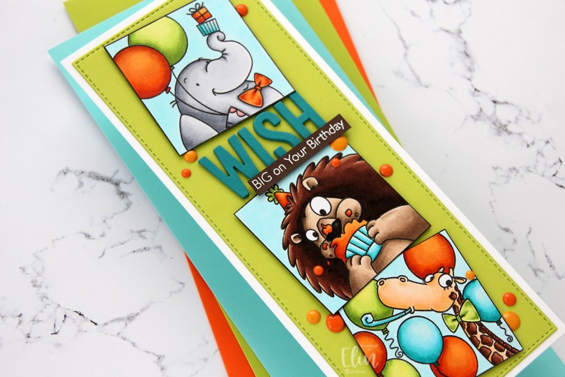 I mounted the colored piece onto a card base made from Limelight cardstock from My Favorite Things. It’s a very bright green. I die cut some leaves from the Leafy Cover die from Mama Elephant and mounted those near the bottom left corner using some 1 mm foam squares.