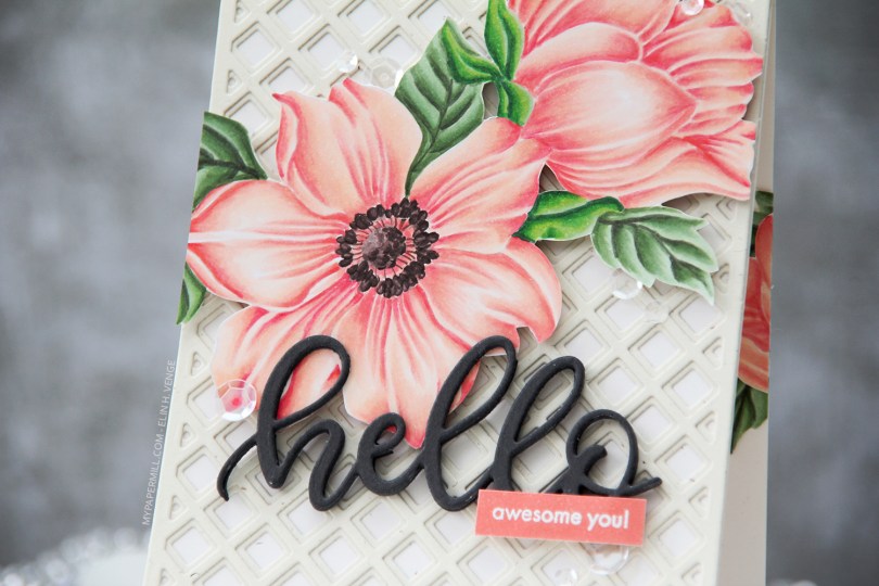 I used the Sweet Hello die from My Favorite Things to die cut six times from Steel Gray heavyweight card stock from My Favorite Things. I stacked the die cuts for a dimensional look, using only three layers for the parts of the dimensional die cut on top of the flowers, to make it as even as I could going across. I colored a piece of X-Press It using my RV42 marker to create a card stock strip to match my flowers. Once dry, I stamped and white heat embossed a sentiment from the Statement Flowers stamp set and glued the strip on top of my hello, before finishing off the card with sequins from the white orchid sequin mix from Little Things from Lucy’s Cards here and there around the sentiment and the flowers.