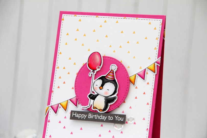 I wanted the focus to be on the party penguin carrying the balloon, and colored him before turning him into a stacked die cut (3 layers behind the colored one). I stamped and die cut the bunting from another stamp in the stamp set, but only added one layer behind each of these, they’re in the background, after all. On a piece of white cardstock, I stamped the Scattered Triangles background stamp using Picked Raspberry and Squeezed Lemonade distress inks. I thought the triangles went well with the bunting, and wanted an ombré effect from the hot pink up to the yellow. I’ve come up with a great trick for achieving this: ink blending on the stamp. By using blender brushes and ink blending onto the actual stamp, I get a really nice gradient in my stamping. It’s a little tough on my blender brushes, and a couple of the bristles have fallen off, but I don’t mind, I don’t normally ink blend that much anyway, a missing bristle or five is a nice trade off for the effect I get – I’ll take it.