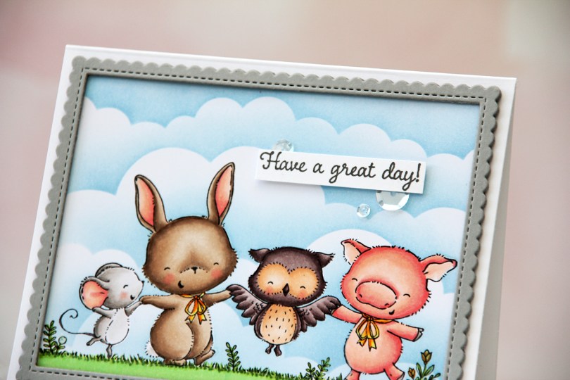 Onto the card. I colored the image with Copics and used a double stitch rectangle die from My Favorite Things to turn it into a nice panel, before adhering it to a top fold card base I made out of Enchanted Evening cardstock from Papertrey Ink. I love their cardstocks.