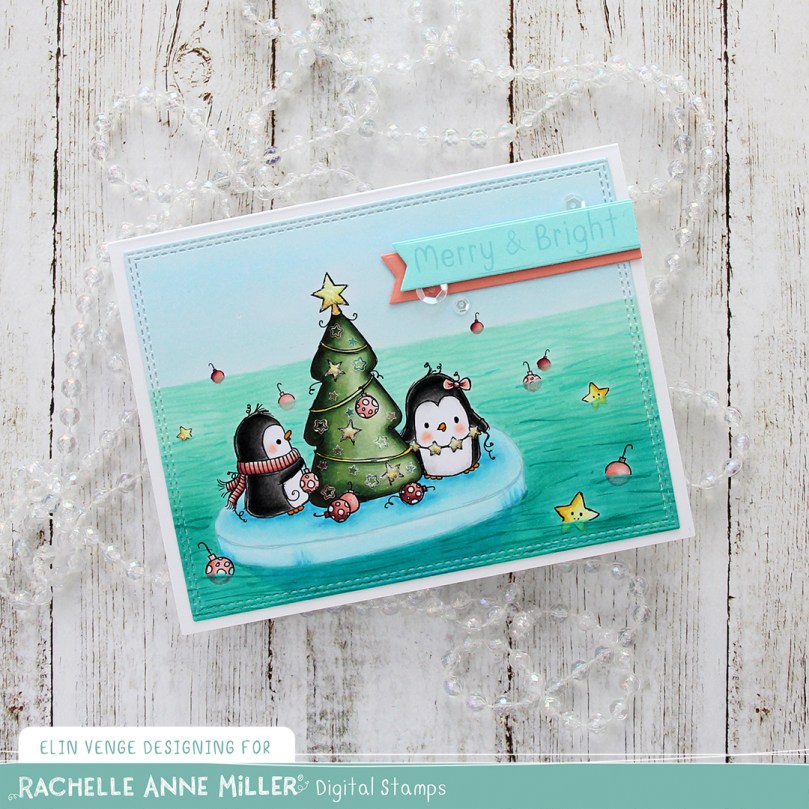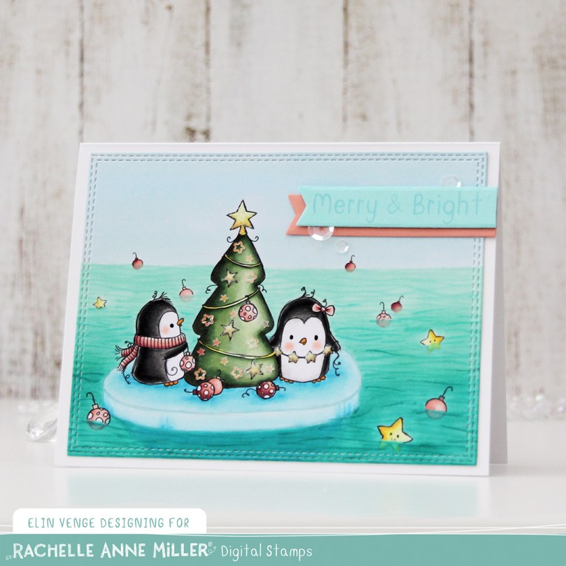 Hi. I’m sharing a sneak peek today. The new release from Rachelle Anne Miller is right around the corner, and this month, there’s a Christmas Penguin Scene Creator set. In the set there are three single penguins, one penguin decorating a tree, a couple of separate trees, a sheet of ice and lots of small elements that coordinate and work well with the larger ones. I’ve used one of the single penguins as well as the one decorating the tree today for the focus of my card.