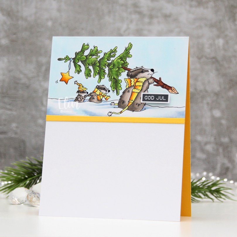 Hi. Sharing a simple mini slimline today with a cute image from Rachelle Anne Miller. I love this Snowman Hug image, and I’ve used it previously for a wintery birthday card, but today, I’ve got a red and tealy blue Christmas card to share. If you use the code ELINVENGE in Rachelle’s store, you get a 10 % discount on your purchase.