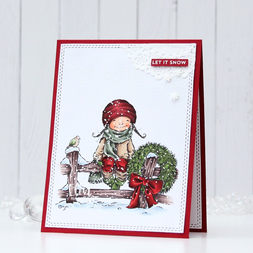Hi! I’m sharing another red Christmas card today. I honestly don’t know what’s going on, but there you go 😉 Today’s card is a very simple one. I colored up Merry Little Christmas about a week ago (there’s also a curly haired version here), and I didn’t add much to her.