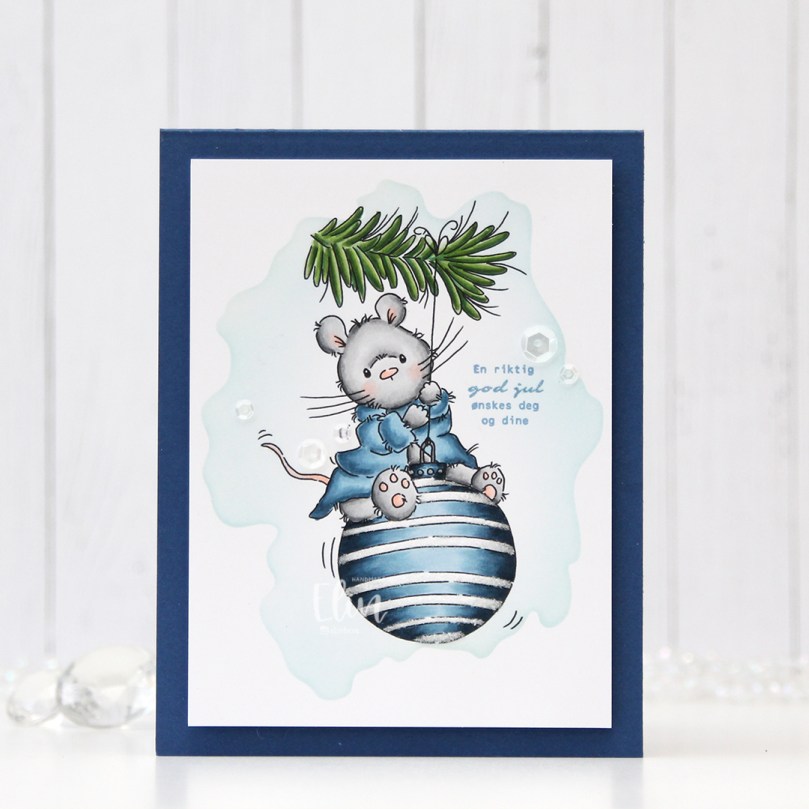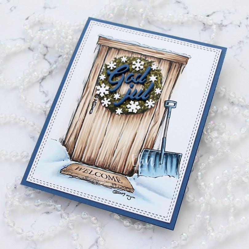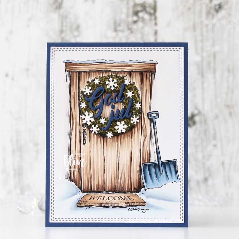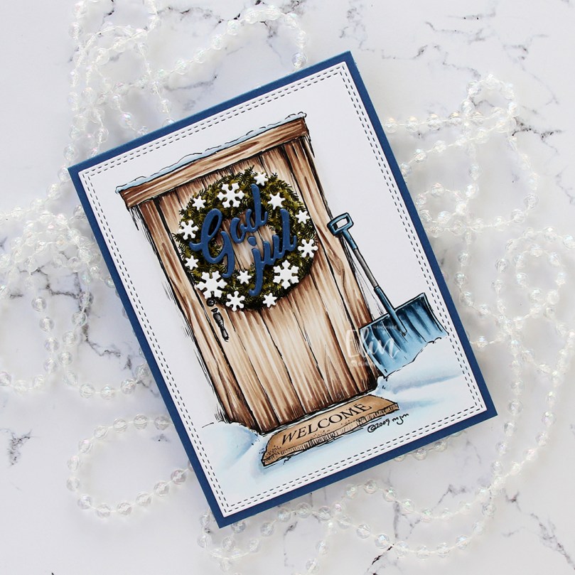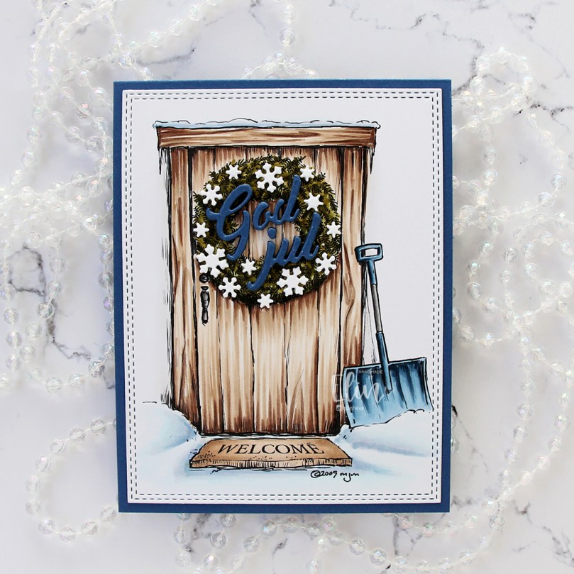 I stacked five God jul die cuts and adhered the layered die cuts to the wreath. The die I used is from Papirdesign. It’s actually a heart with the letters inside, I just skipped the heart and used the letters by themselves. I adhered tiny white snowflakes on the wreath, and I used a die from Hero Arts to die cut those. I stacked these too, but only two layers. And that’s the whole card, super simple.