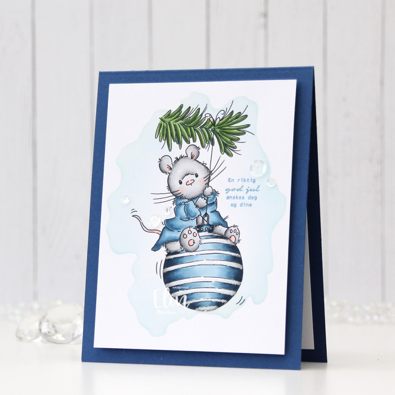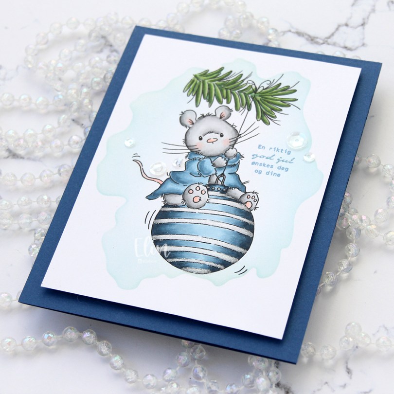 I stamped a sentiment from Norsk Stempelblad AS using Blue Yonder ink from My Favorite Things. I don’t have ink in the discontinued Blueberry color, and I didn’t want to use too dark of a blue ink, so I triple stamped using the Blue Yonder instead. It matches the robe pretty well.