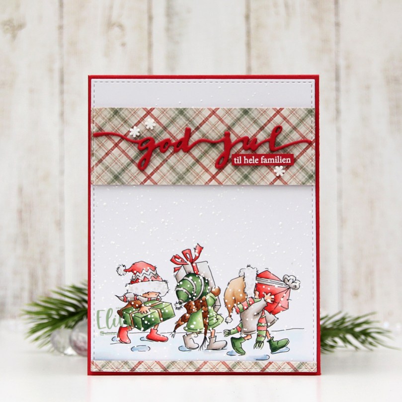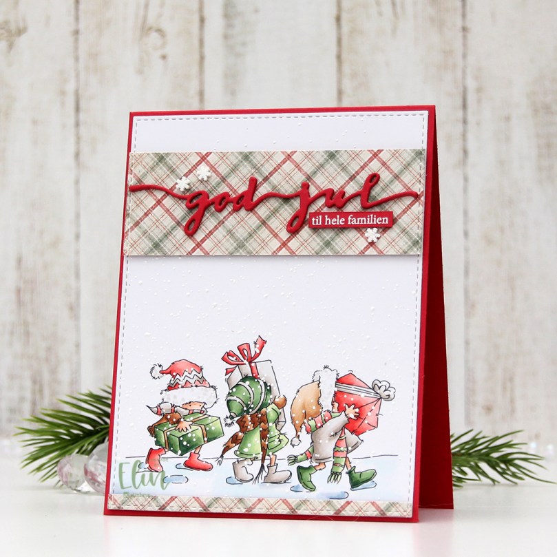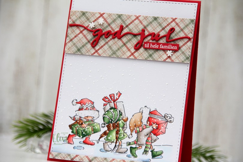 I’m usually good at using scraps of patterned paper and rarely use a brand new sheet. Today was the day, though. I thought this patterned paper from the I wish collection from Maja Design went really well with my coloring, and I didn’t have a single scrap of this particular paper. Using the same die that I used on the white panel, I die cut my patterned paper before cutting up my die cut into pieces I could use on my card. I added two layers of cardstock behind both pieces and glued them to my card. I now have a continuous stitched border, even though some of it is my colored panel and some is patterned paper. I love little details like that. I die cut three of the god jul die from Papirdesign from red cardstock and glued them together for a stacked look. I glued my die cut to the center of the wide patterned paper before adding a sub sentiment. The sub sentiment is from Norsk Stempelblad AS, white heat embossed on the same color red cardstock and cut down to a strip, with two additional pieces of cardstock behind it to make it flush with the die cut. I added three snowdrift sprinkles from Little Things from Lucy’s Cards to the patterned paper, and my card was finished.