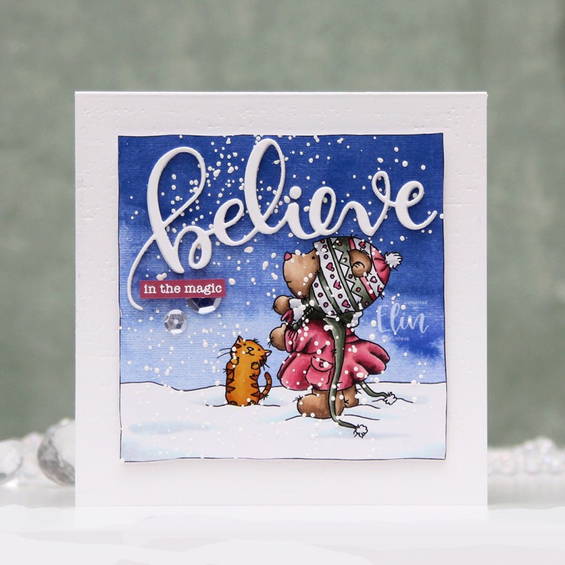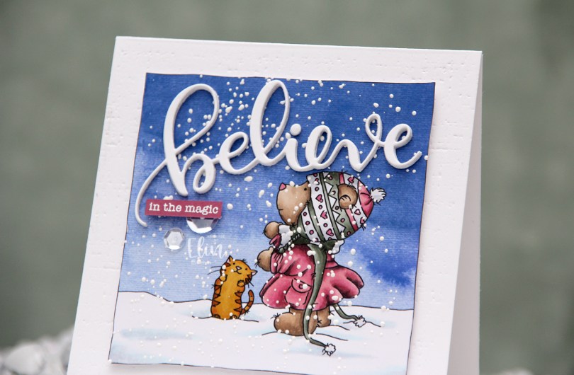 I created a 4 1/2 x 4 1/2″ card base from Stamper’s Select White cardstock from Papertrey Ink and used an impression plate, also from PTI, to create subtle texture to the base. I put a few extra layers of cardstock behind my image and adhered it in the center of the card. I die cut the word believe using an older die from Simon Says Stamp four times from white cardstock and glued them together for a stacked, dimensional look in the sky above the bear. I finished off with a sentiment from Mama Elephant that I white heat embossed onto a strip of Autumn Rose cardstock from Papertrey Ink and embellished with a couple of Sparkling Clear sequins from Pretty Pink Posh.