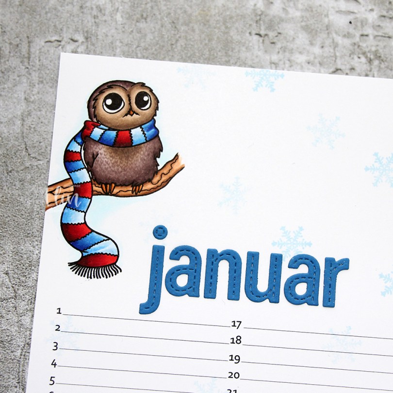 My page for the January calendar features this cute owl from Haven Hill Crafts, from the Snowed Inn stamp set, which also includes a sweet fox and the coolest moose! The owner, Hanna, contacted me in the fall, asking if I would like to play with some of her stamps. Of course I had to say yes. This owl is so cute, and there’s also an awesome washi tape stamp in the stamp set.