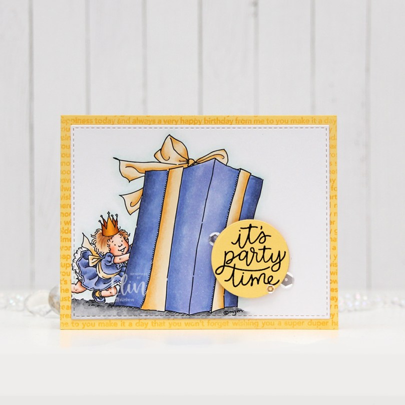 I colored in the image with my Copics, used the second largest die from the A2 Stitched Rectangles STAX Set 1 die set from My Favorite Things to create the wonderful stitching on the border of the colored piece and adhered it to a card base I created from Harvest Gold cardstock from Papertrey Ink. I clear heat embossed the Happy Birthday background stamp from MFT on the card base. I stamped a sentiment from the Scripty Bday set from Mama Elephant in VersaFine Onyx Black ink and clear heat embossed, turned it into a circle using a nesting die and adhered it to the card using foam tape, before finishing off the card with a few Sparkling Clear sequins from Pretty Pink Posh.