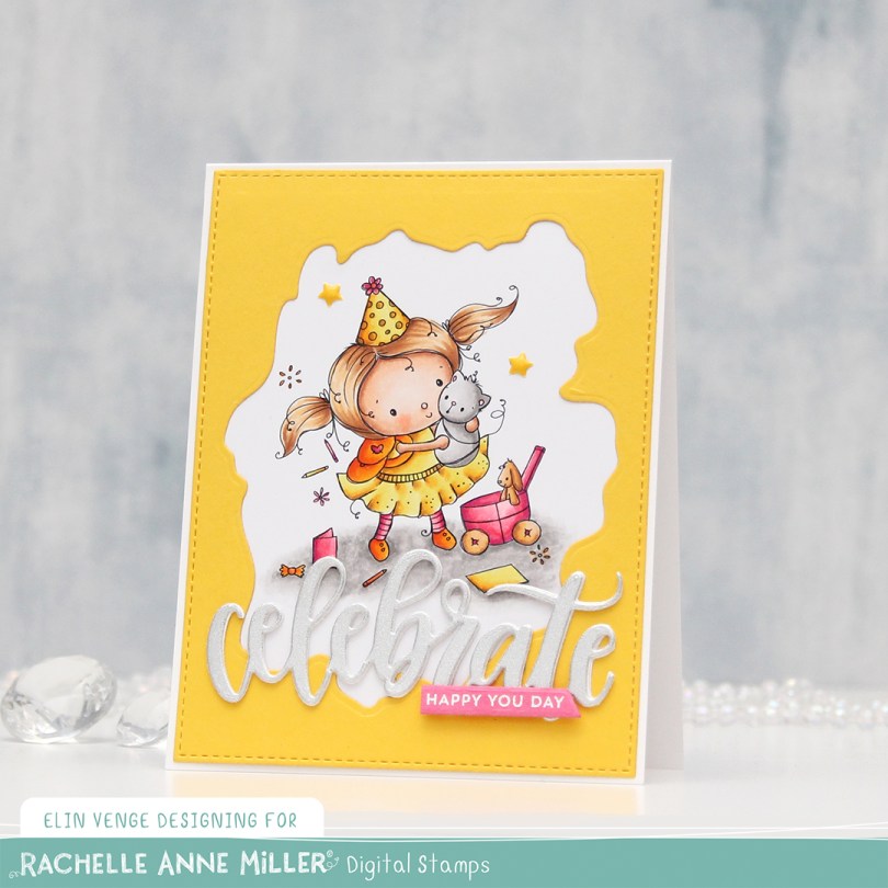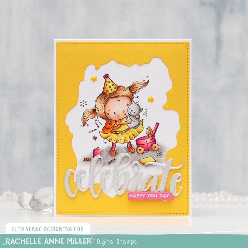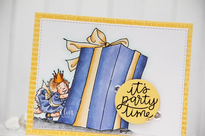 I colored my image with Copics and put it aside while I worked on the rest of the card, which I kept fairly simple. I used the largest die in the A2 Stitched Rectangles STAX 1 set from My Favorite Things in combination with the Watercolor Wash Free Form die, also from MFT, to die cut a window from Bright Buttercup cardstock from Papertrey Ink. I adhered the image to the back of this window and adhered it to my card base, which I made from Stamper’s Select White cardstock from Papertrey Ink.