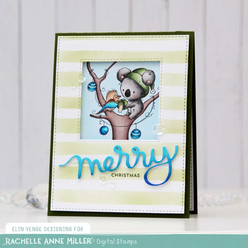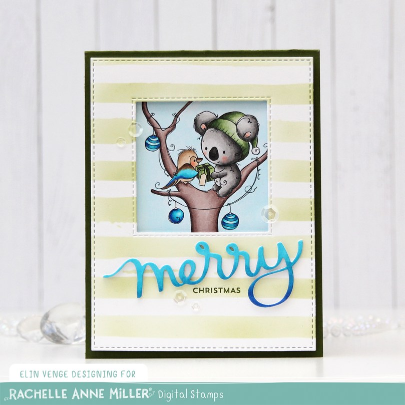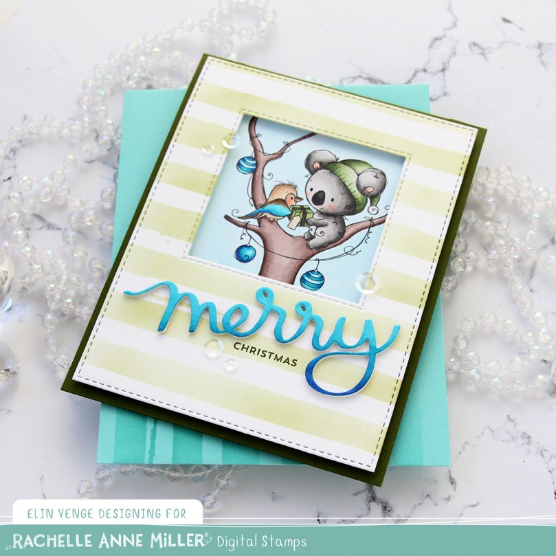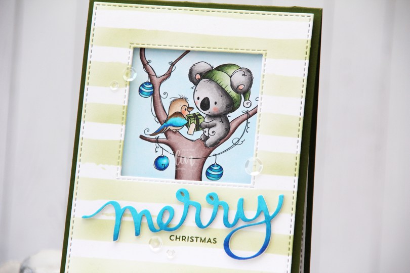 I colored the cute little scene with Copics and put it aside while I worked on the rest of my card. On a separate piece of X-Press It blending card I blended the same three blueish teal colors that I used for the kookaburra and the ornaments to create an ombré effect, and used the Merry Script die from Mama Elephant to create part of a sentiment that would match my coloring. I added three white die cuts behind it for dimension to make it stand out on my card.