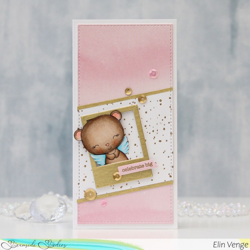 I colored the bear quickly with Copics, fussy cut and put the image aside while I worked on the rest of my card.