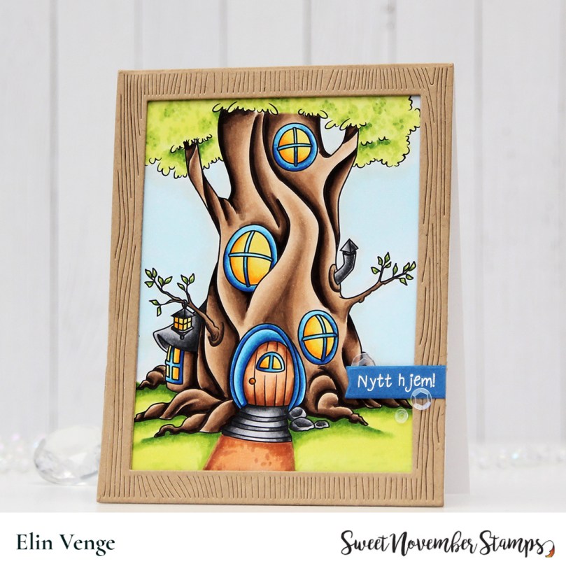 Hi, crafty friends. I’m back with another card made with the brand new release from Sweet November Stamps. This time I used the Forest Abode stamp set, which is a 4×8″ set that comes with the tree house I’ve used here, a sentiment and another smaller tree house. The one I’ve used is sized perfectly to fit the front of an A2 card, the smaller one is perfect as a backdrop behind the fairies and other cuties from the release.