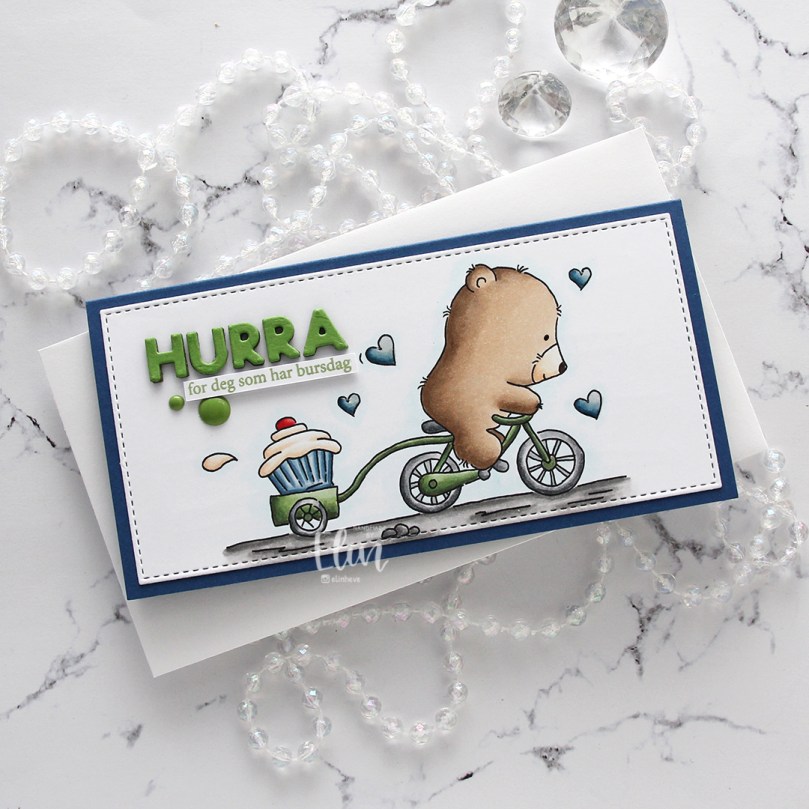 I actually made this card for my dad, whose birthday was last week. He loves his cakes and desserts, and has a stationary bike that he works on on almost daily (while watching police car chases on YouTube; no joke), and I thought this image would be perfect for him, with the little bear on his bike and the cupcake trailing behind. I colored the image with my Copics and used the Stitched Mini Slimline STAX die set from My Favorite Things to turn it into a panel that would fit nicely on a mini slimline card. I then die cut the letters to spell HURRA three times from Jalapeño Popper cardstock from My Favorite Things and stacked them for a dimensional look, before deciding that the green was too dark. I didn’t want to start over, so I using the same dies (the Connected die set from My Favorite Things), I cut an additional layer from Parsley cardstock from Concord & 9th and glued that on top of the dark green. I like the lighter green better.