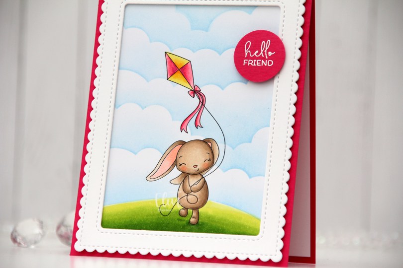 This image is sooo sweet, I just had to create a card using it. There’s also a butterfly in the image, which I erased before printing, I just wanted the bunny with the kite for this card. I created a very simple grassy hill below her feet and used the Rolling Clouds stencil from My Favorite Things along with Eastern Sky ink from Altenew to create the clouds behind her.