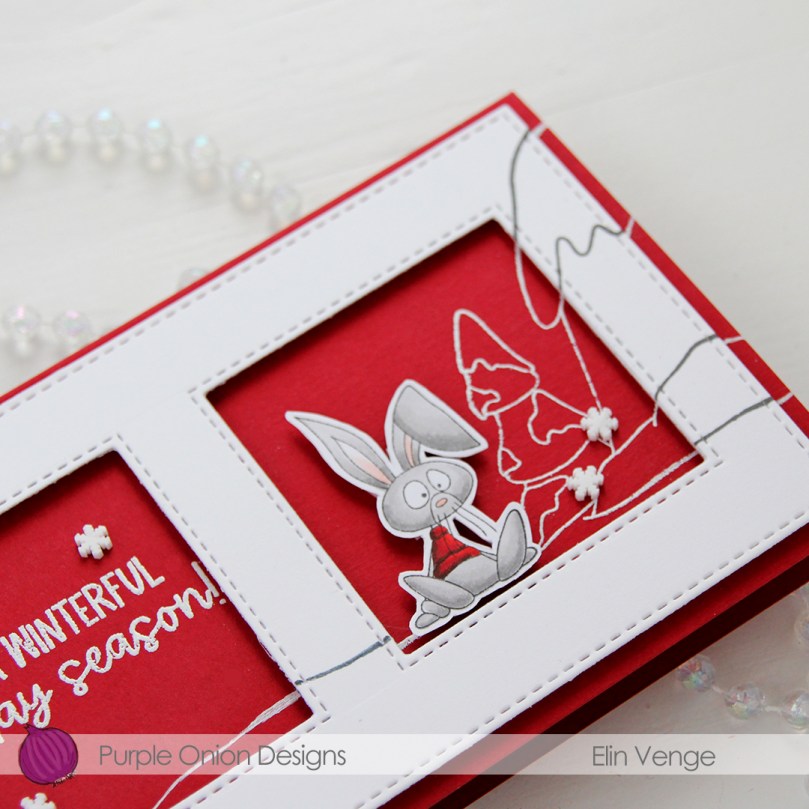 I used a couple of dies from My Favorite Things to create the window openings and the faux stitch edge around the white cardstock. I stamped the Snow Much Fun background stamp twice; once in gray ink on the white cardstock, and once in VersaMark ink that I white heat embossed on the red card base for a continuous look across the entire card. I also stamped and white heat embossed a sentiment from the Snow Much Fun sentiment set in the center of the card.