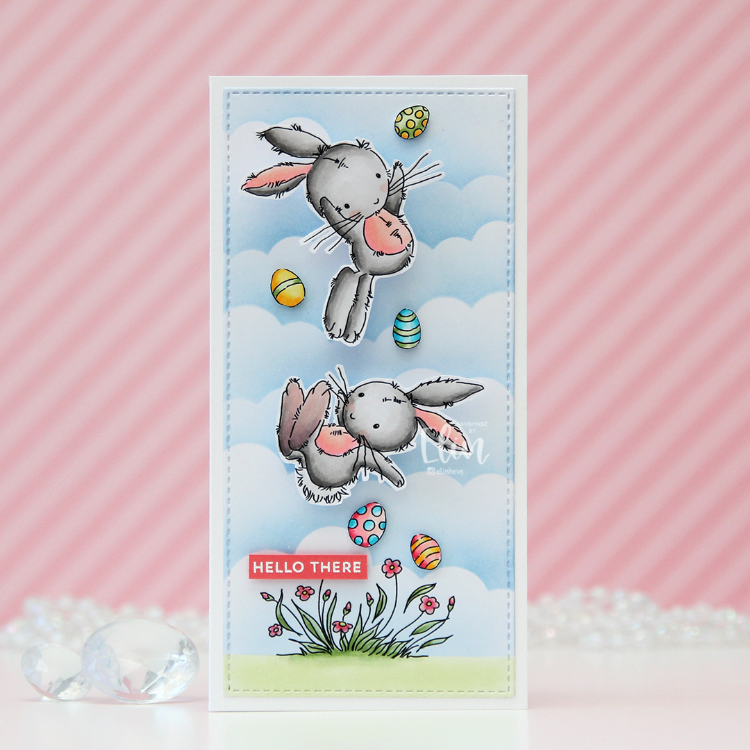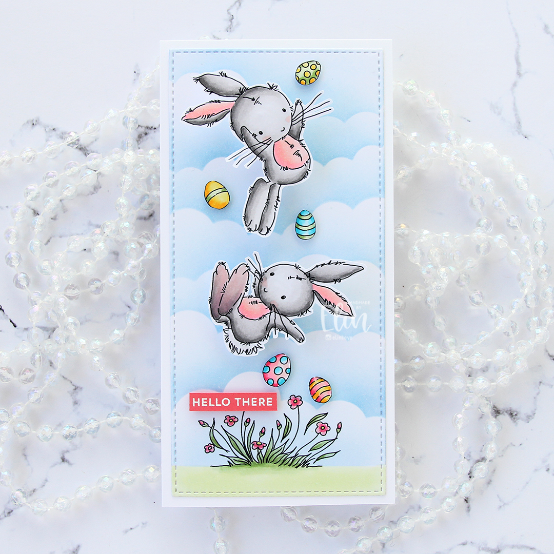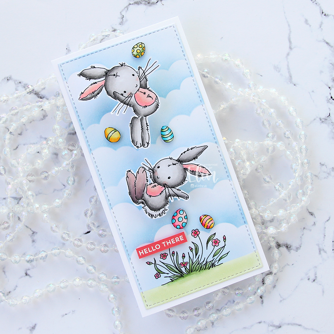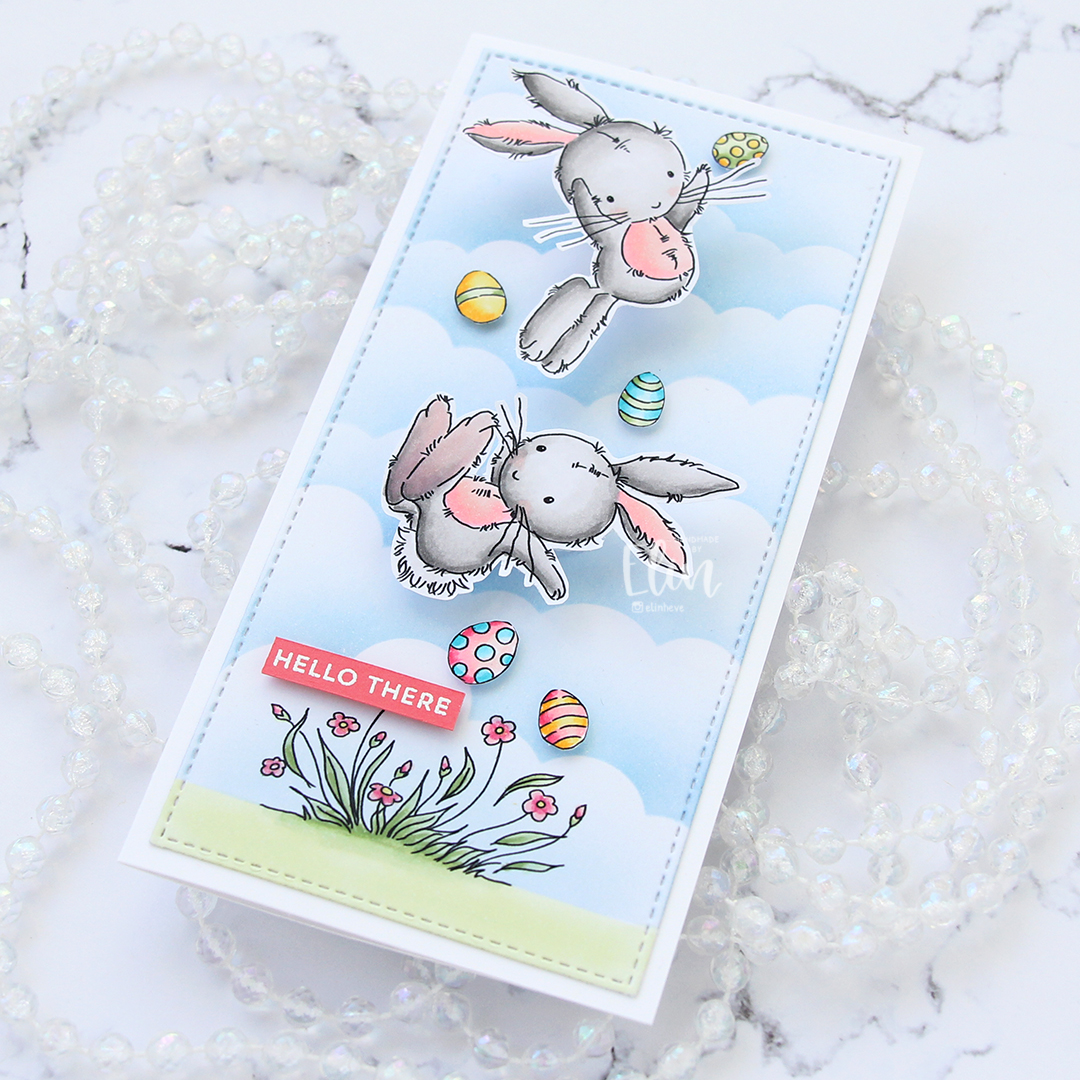 I had so much fun creating this card. I originally colored everything on one panel, but then decided to put the bunnies on action wobbles. I fussy cut the bunnies leaving a thin white border, fussy cut the eggs right up to the black lines and printed the grass and flowers at the bottom on a separate panel.