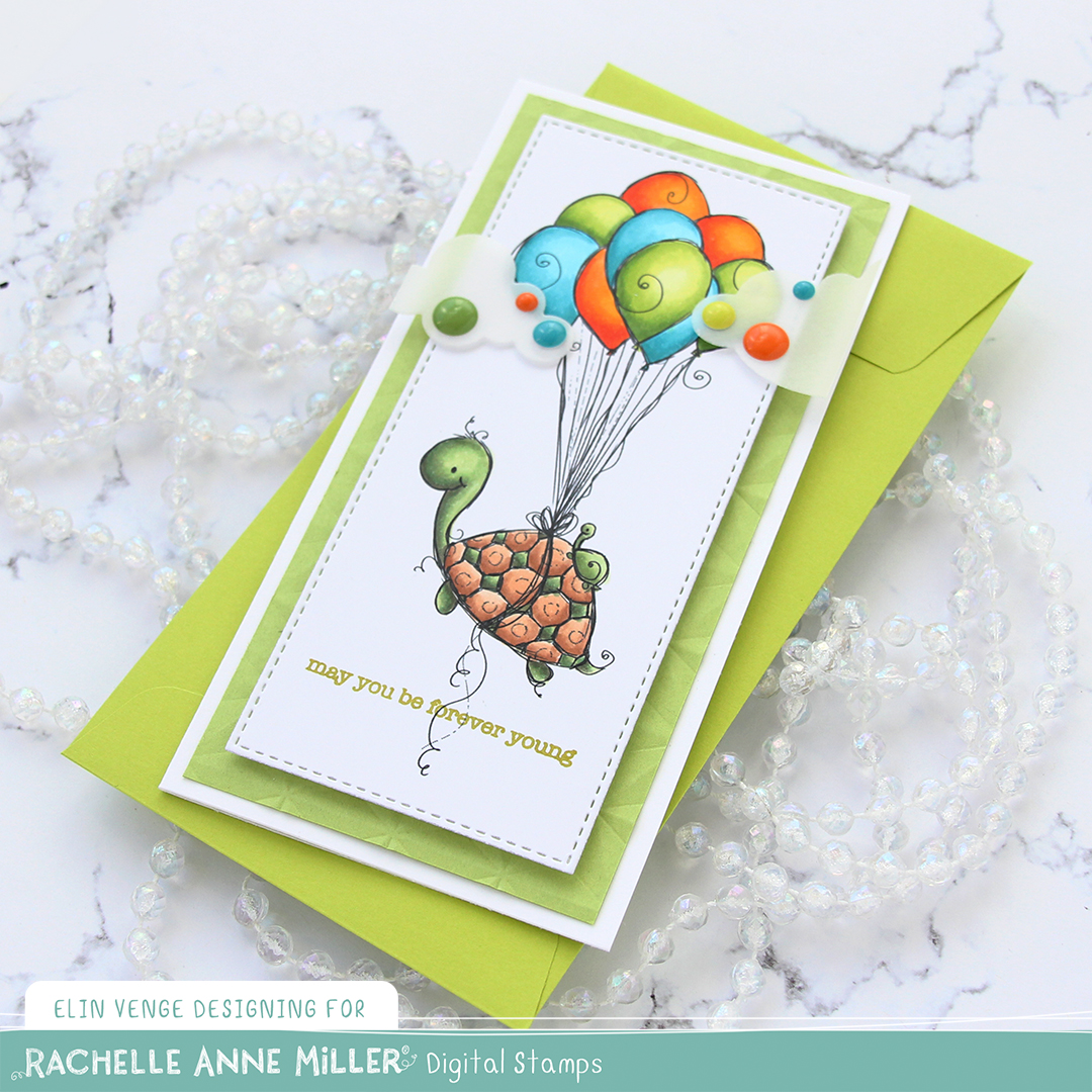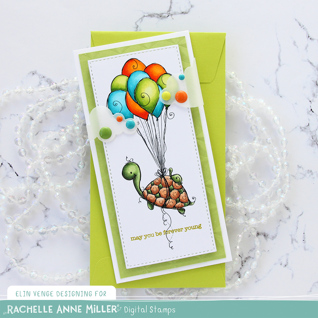 I recently made a full shaker card with another image from Rachelle with lots of balloons. That card was all in warm tones, so I thought I’d use cool tones for this one. I did add a few orange balloons, though, I think orange is a fun color to use with teal and green. I used a die from the Stitched Mini Slimline STAX set from My Favorite Things to turn my colored piece into the perfect rectangle to fit a mini slimline card. I stamped a sentiment from the Birthday messages stamp set from Mama Elephant using Prickly Pear ink from My Favorite Things and put the panel aside while I worked on the rest of my card.