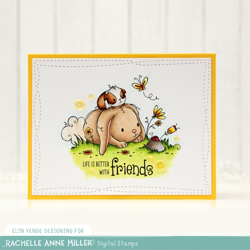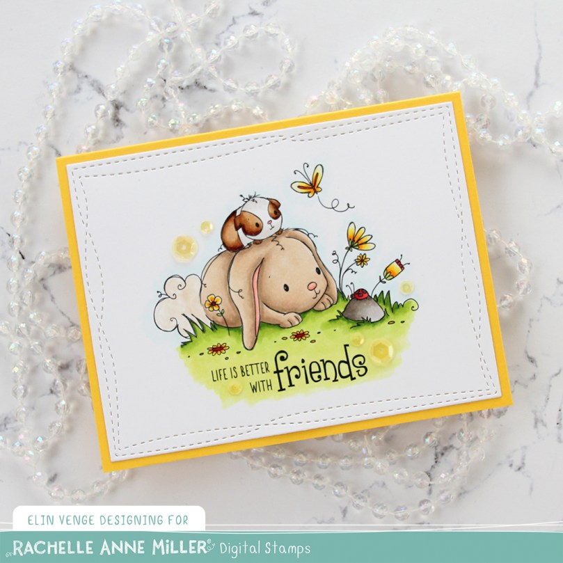 I colored the image with Copics, then used a die from the A2 Double Stitched Rectangles STAX set from My Favorite Things to create the faux stitch look around the edge that I really enjoy having on my cards.