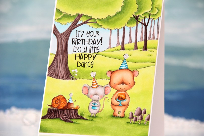 My first card with images from the release is this one. I love creating birthday cards, so this collection is right up my alley!! Using Extreme Black ink from My Favorite Things, I stamped and masked Hugh (snail), Sage (mouse) and Dylan (bear) before stamping the mushrooms and the tree stump from the woodland floor set, as well as the woodland background. I colored in my scene using Copics, then stamped the sentiment from the Let’s Celebrate sentiment set using VersaFine Onyx Black ink. The stamp was perfect to nestle into the clearing between the trees.