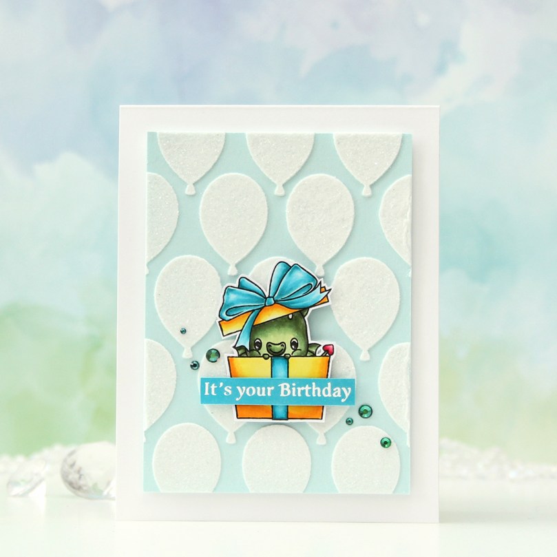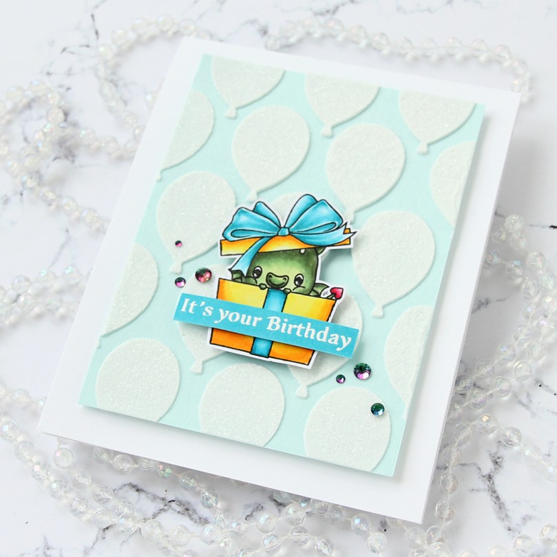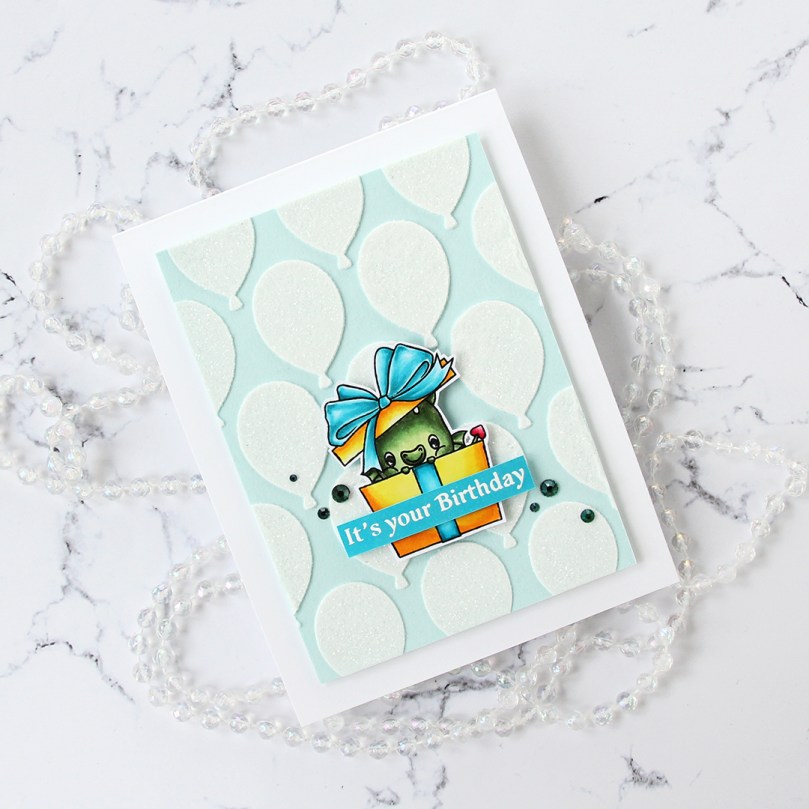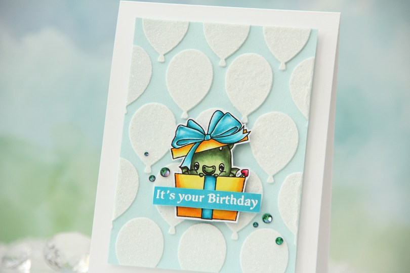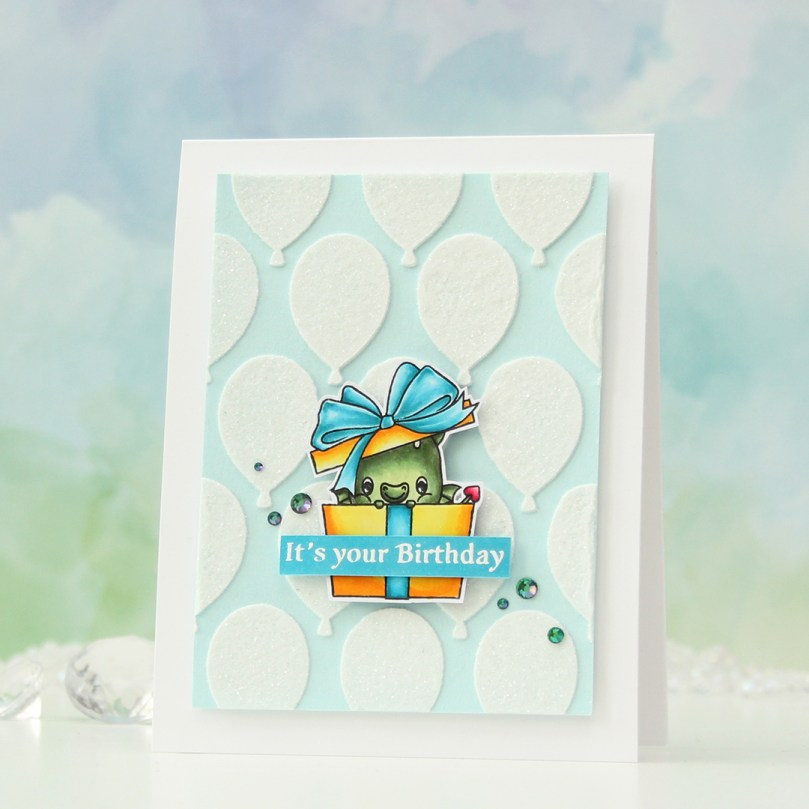 Using 1/16″ foam squares, I added my colored dragon towards the bottom center of the card. I added a little bit of liquid glue to make sure it really adhered to my glitter balloons, I didn’t want it coming off at any point. I didn’t have the right shade of cardstock to match my tealy blue coloring, so I colored a scrap strip of X-Press It blending card using one of the markers I used for the bow, before stamping and white heat embossing a sentiment from the Flamin’ Birthday stamp set. I cut it to fit the sentiment, added a couple of strips of cardstock behind it for dimension and stability and adhered it to the present.