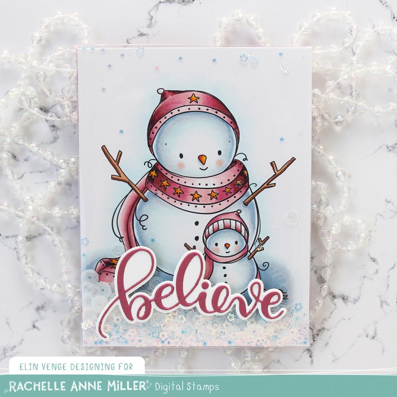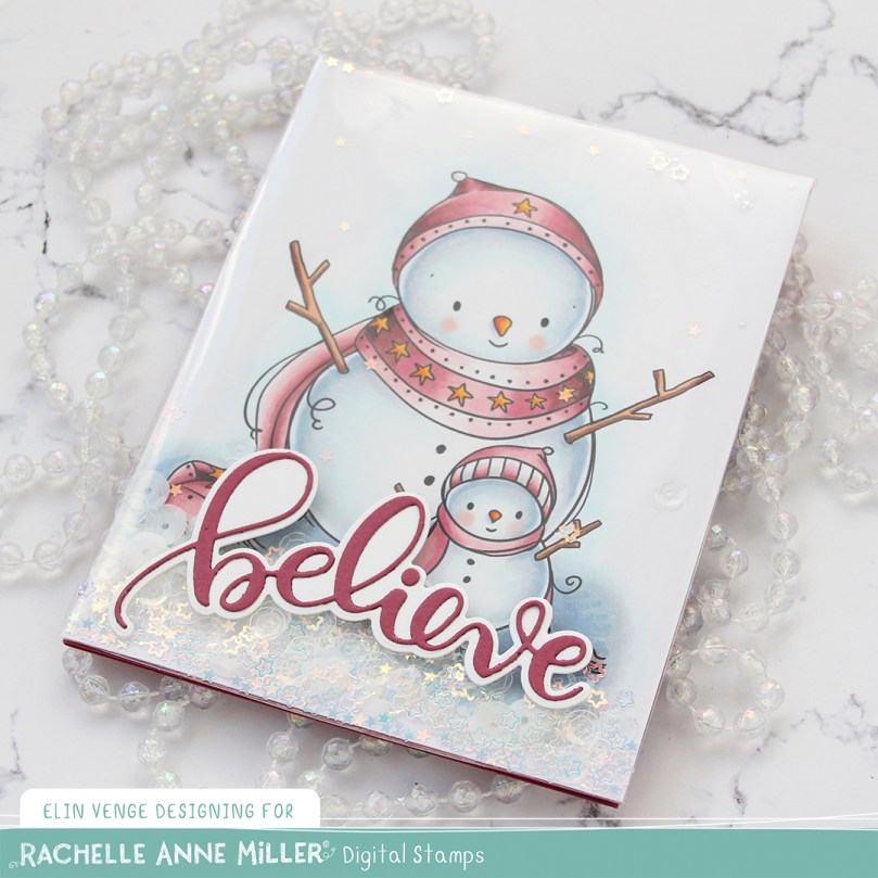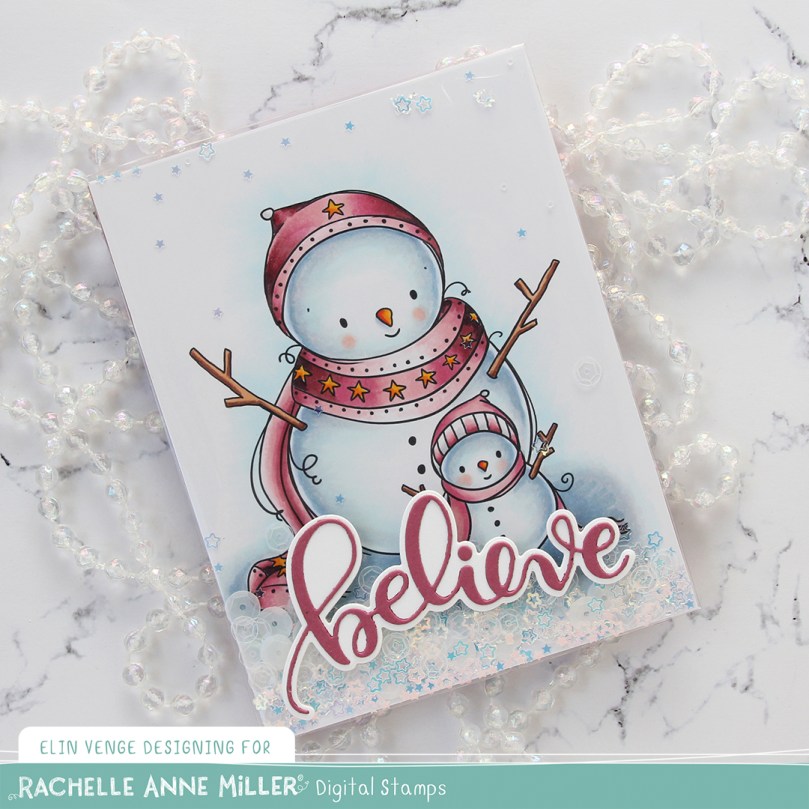 This is the Snowman Family stamp from Rachelle Anne Miller. She creates the cutest snowmen. I printed the image so it covered most of my panel and colored it with Copics.